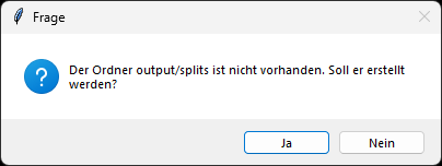 Sollte der Ausgabeordner noch nicht vorhanden sein, wird gefragt, ob er erstellt werden soll. Der Ausgabeordner ist notwendig um die Dateien zu speichern. Die Meldung sollte mit "Ja" bestätigt werden.