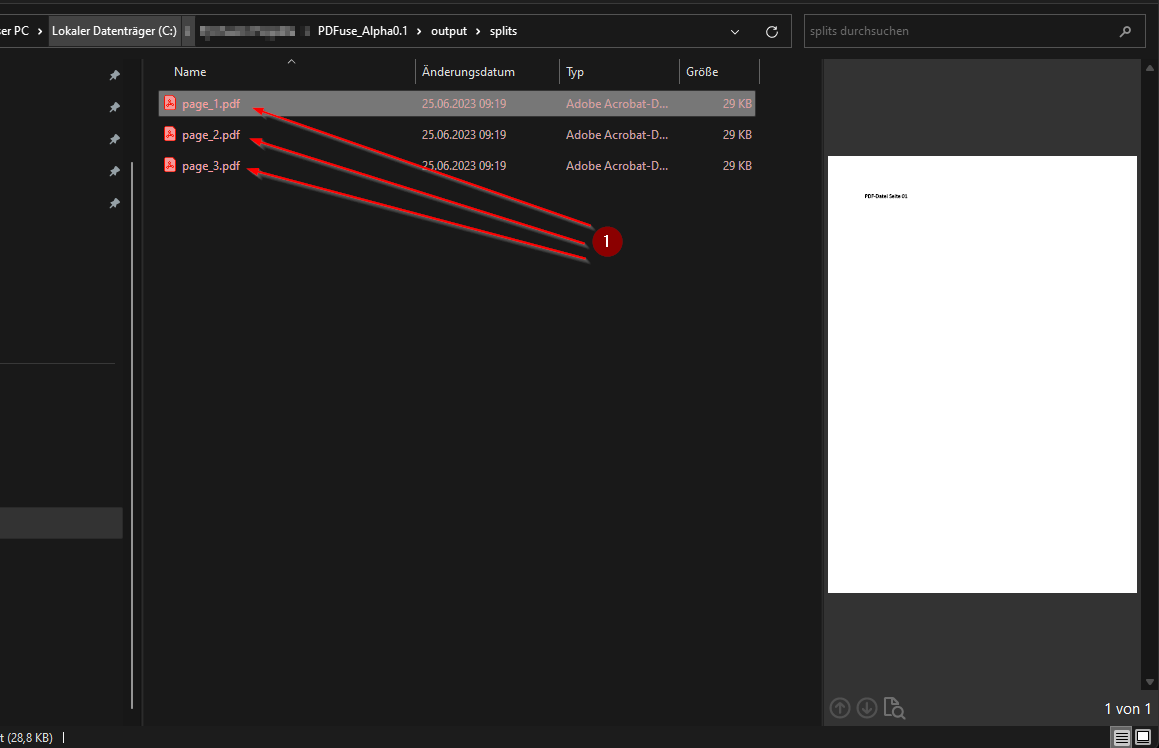 - Startet den Splitter um aus einer PDF-Datei alle Seiten zu extrahieren und zu speichern.